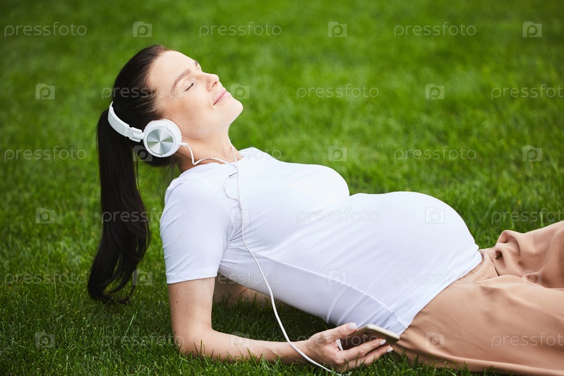 Беременная женщина отдыхает на траве