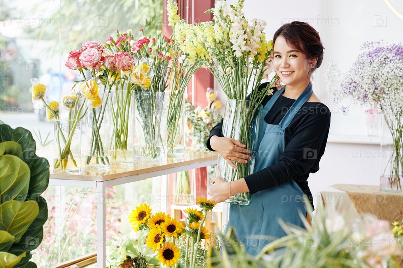 Молодая женщина, работающая в цветочном бутике