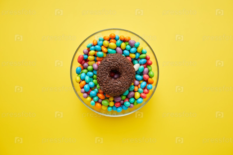 Высокоугольный вид желе бобов и шоколадной пончики с посыпаниями в стеклянной чашке на желтом фоне