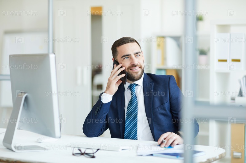 Позитивный менеджер проекта обсуждает планы по телефону