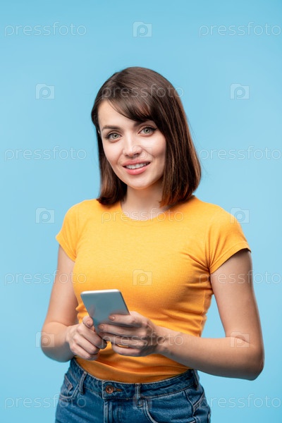 Молодая деловая женщина в повседневной одежде прокручивает или обменивается сообщениями на смартфоне