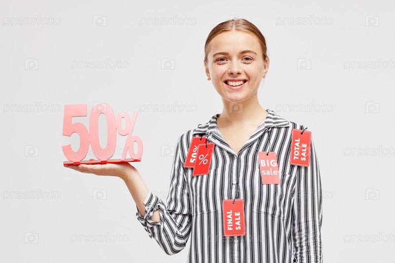 Улыбающаяся привлекательная молодая женщина в раздетой блузке с красными тегами, рекомендующей покупать одежду со скидкой