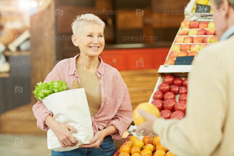 Улыбающаяся взрослая женщина покупает овощи на фермерском рынке