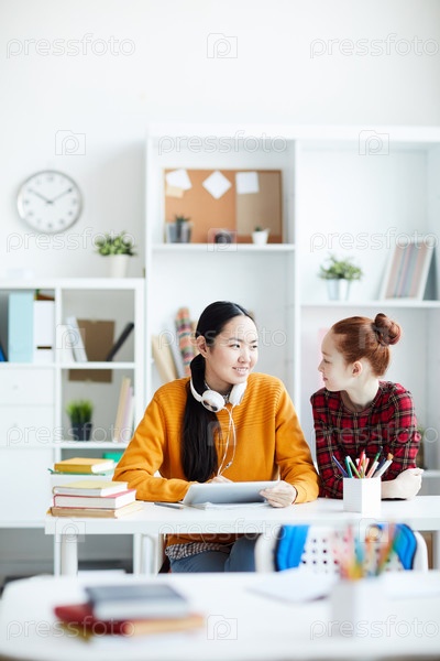 Улыбающаяся привлекательная молодая азиатская женщина с проводными наушниками на шее сидит за столом и смотрит на одноклассницу, пока они обсуждают интернет-видео