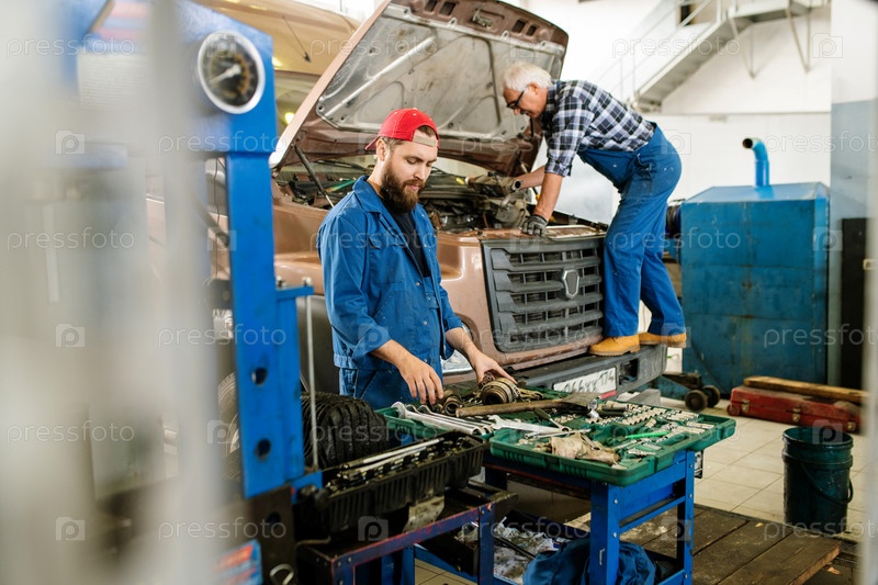 Молодой мастер по ремонту рабочей одежды стоит рядом с открытым набором различных рабочих инструментов