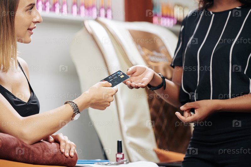 Молодая женщина платит за маникюр