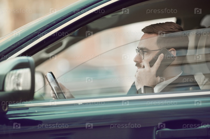Мужчина, использующий мобильный телефон в машине