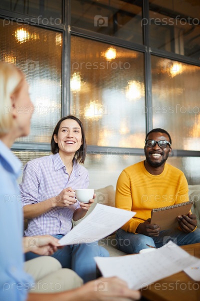 Смеясь над молодыми мультиэтническими коллегами, сидящими на ковчеге и разговаривающими с дамой во время совместной работы с газетами в кафе