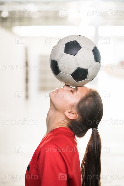 Молодая футболистка в красной футболке, держащая футбольный мяч на лице