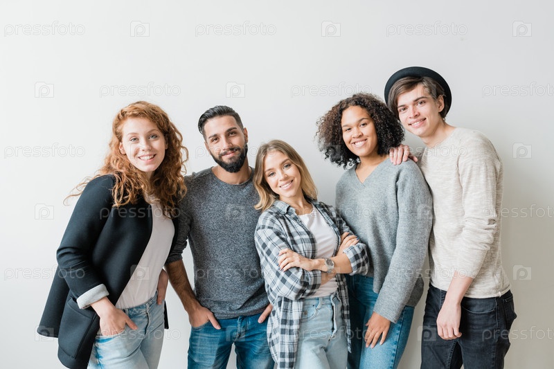 Улыбающиеся парни и девушки в повседневной одежде стоят у белой стены перед камерой