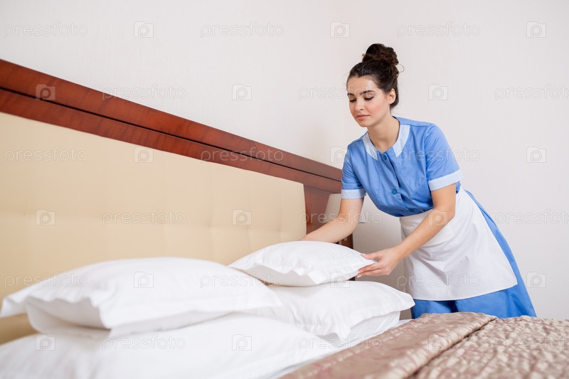 Красивая молодая брюнетка в униформе кладет белые свежие подушки на кровать