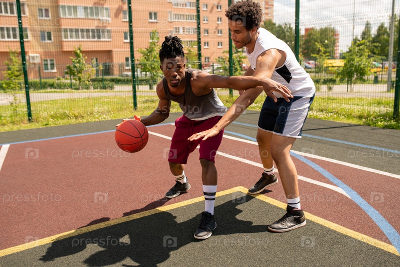 Молодой инструктор по баскетболу помогает африканскому спортсмену с одним из упражнений