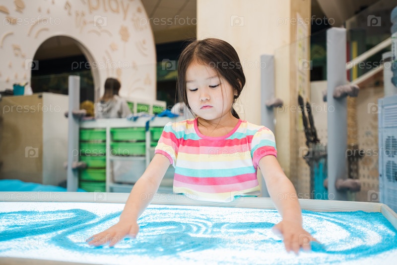 Милая маленькая девочка азиатской этнической принадлежности делает картину из голубого песка своими руками