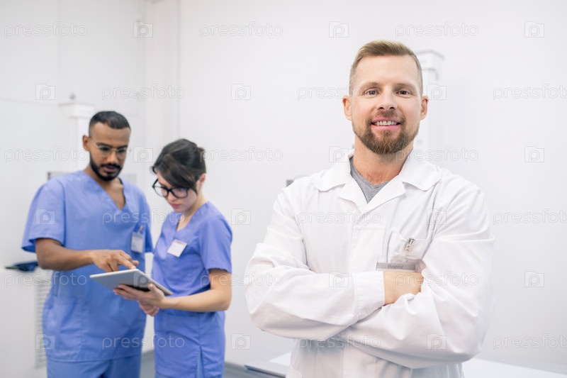 Молодой успешный бородатый клиник в белом халате стоит перед камерой