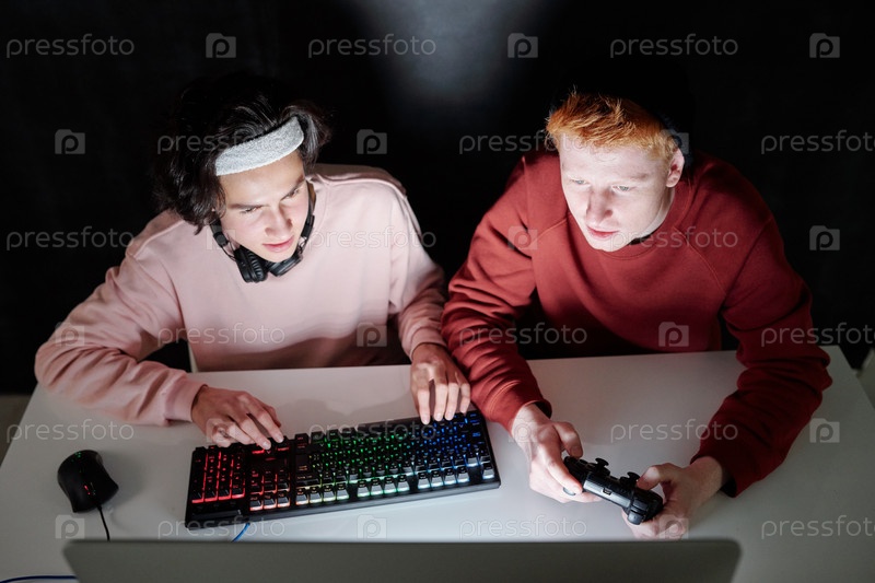 Два дружелюбных парня в непринужденной одежде играют в компьютерные игры, сидя за столом