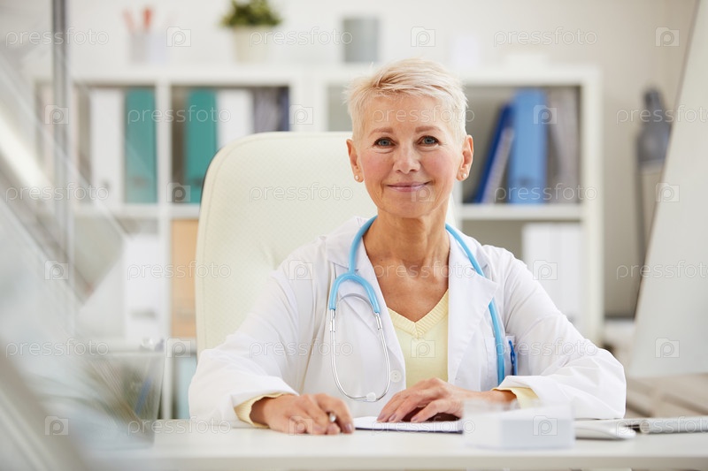 Контент клиника врач со стетоскопом вокруг шеи удовлетворен своей работой сидит за столом и смотрит на камеру