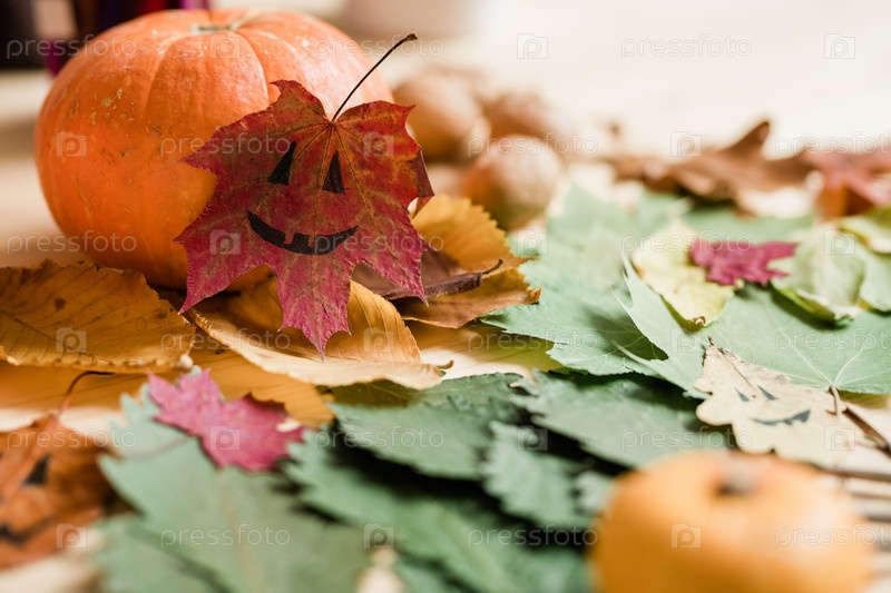 Сухое красочное осеннее листво, большая спелая тыква и нарисованные лица на листах