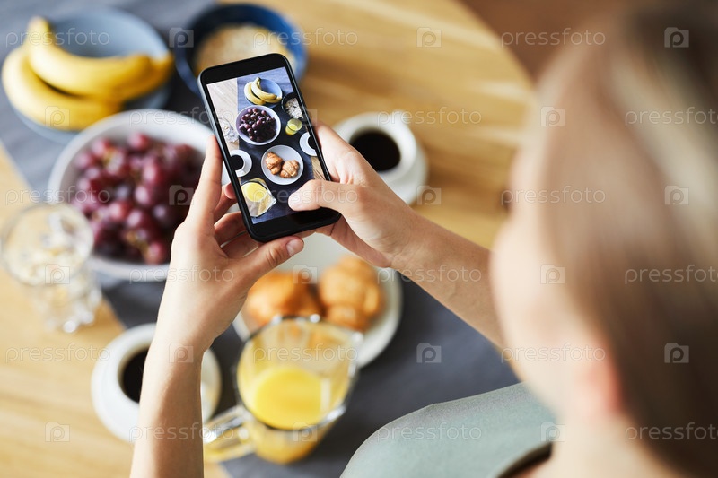 Современная девушка со смартфоном делает снимок своего приготовленного стола