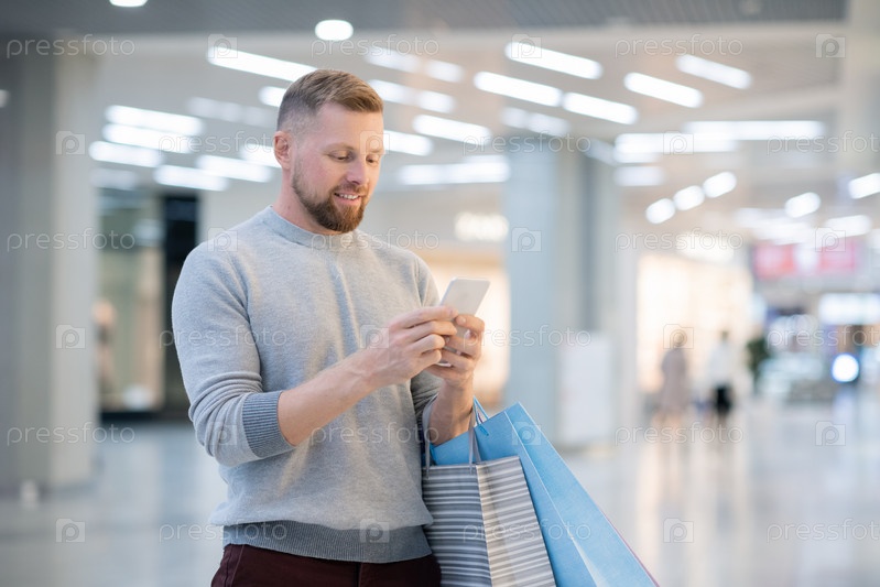 Молодой человек с бумажными пакетами и смартфоном смотрит на рекламу на экране