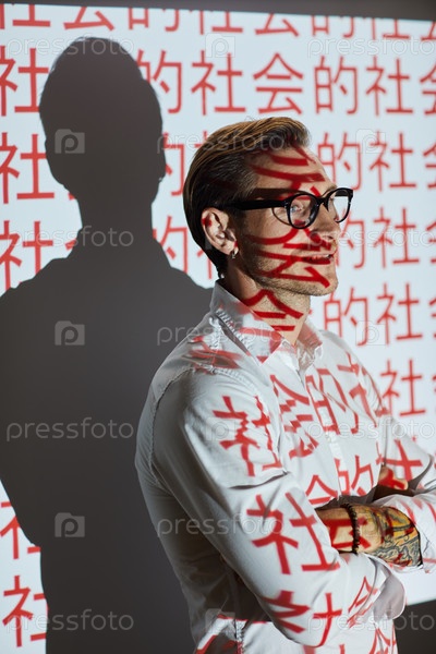 Улыбающийся красивый молодой аналитик в белой рубашке стоит у экрана с иероглифами, изучая потребности китайского народа
