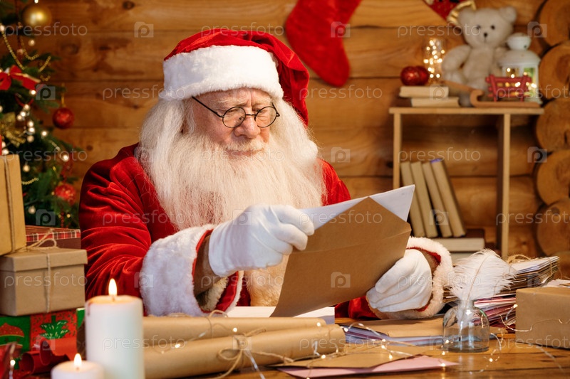 Серьезный Санта сидит за столом дома и кладет письмо в конверт