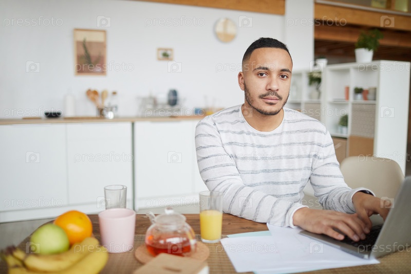 Молодой человек смешанной расы, использующий ноутбук дома
