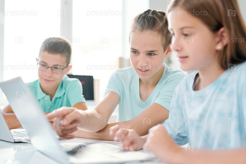 Умный мальчик указывает на дисплей ноутбука, показывая что-то девушке