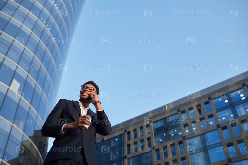 Улыбающийся современный молодой чернокожий бизнесмен в костюме разговаривает по мобильному телефону и пьет кофе, гуляя по улице