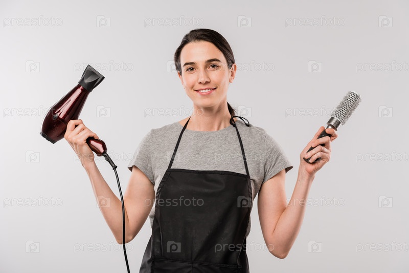 Счастливая молодая брюнетка-прическа в фартуке, держащая фризер и кисть