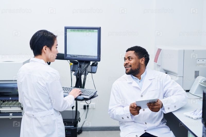 Мультиэтнические медицинские работники обсуждают научные исследования