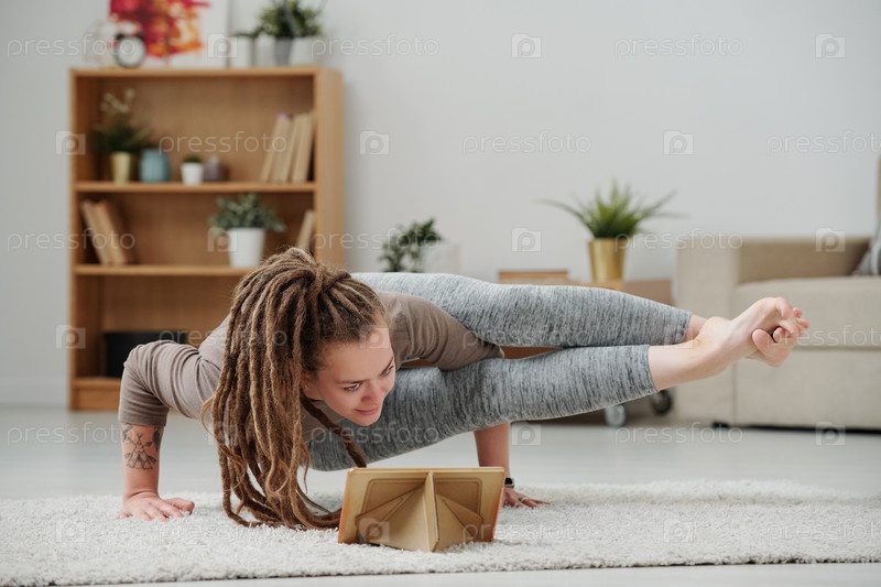 Молодая женщина, стоящая на руках в одной из позиций йоги перед сенсорной панелью