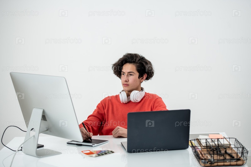 Молодой серьезный фрилансер ретуширует изображения перед монитором компьютера