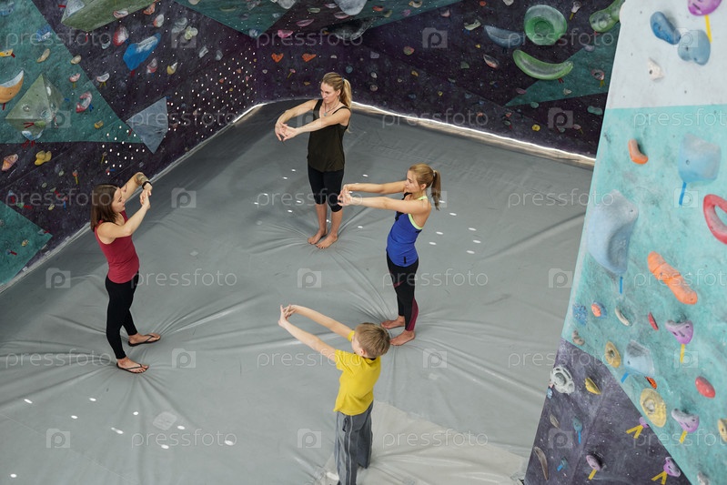 Три ученика повторяют упражнение для рук после своего инструктора