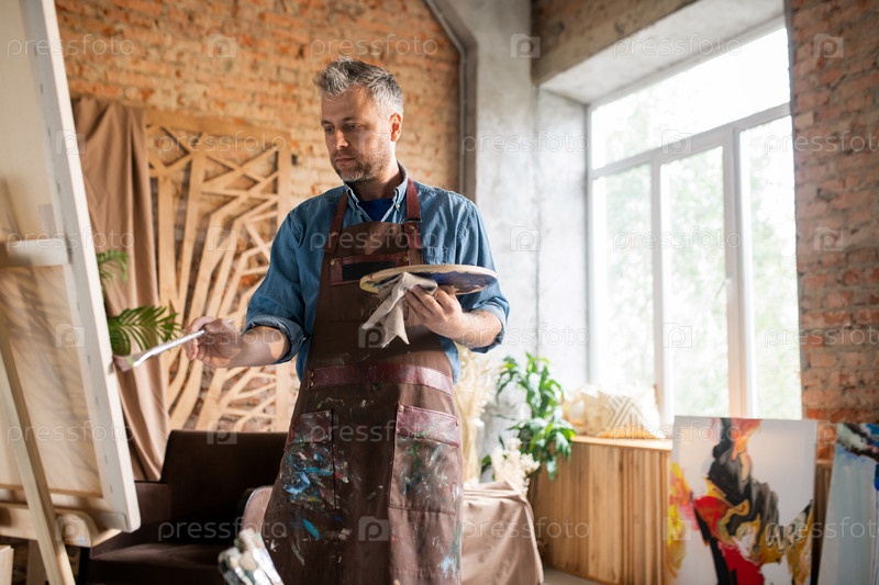 Мужчина средних лет в фартуке смотрит на картину на эстафете, работая в студии