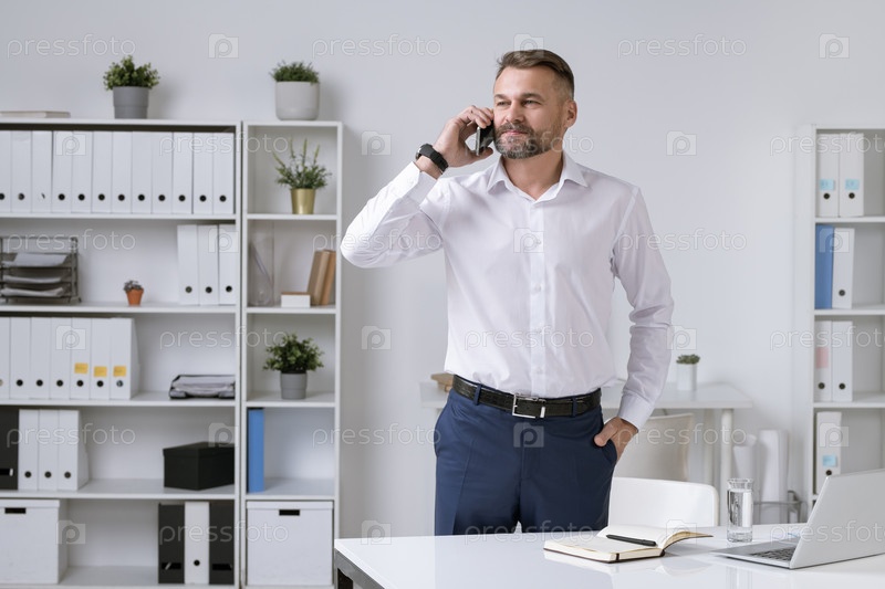 Серьезный и уверенный предприниматель в формальной одежде держит смартфон за ухо