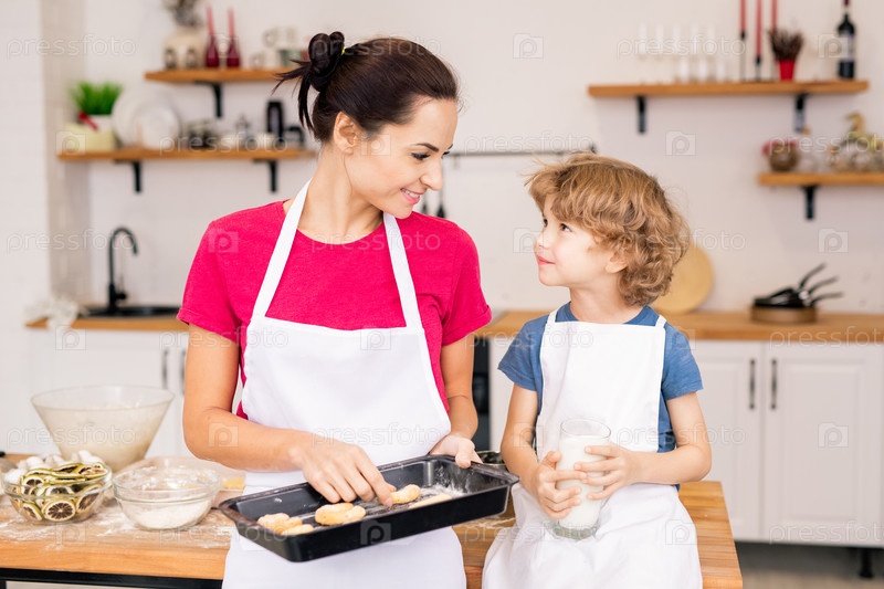 Счастливая молодая мама держит поднос с печеным печеньем, глядя на своего маленького сына