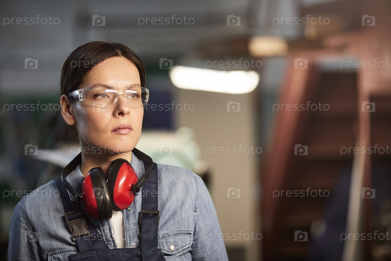 Вдумчивая привлекательная женщина средних лет в рабочей одежде и защитниках ушей, стоящая в темном магазине фабрики и размышляющая вокруг