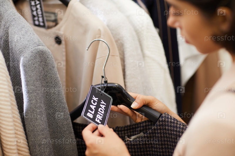 Молодая женщина покупает одежду на распродаже