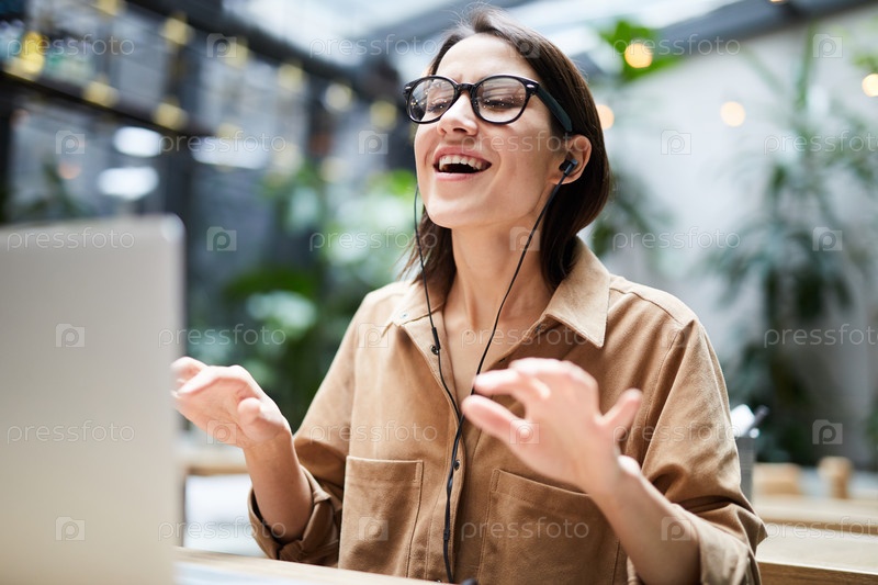 Молодая женщина поет свою любимую песню на рабочем месте