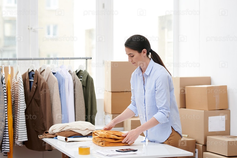 Молодой менеджер складывает один из предметов новой коллекции сезонной повседневной одежды