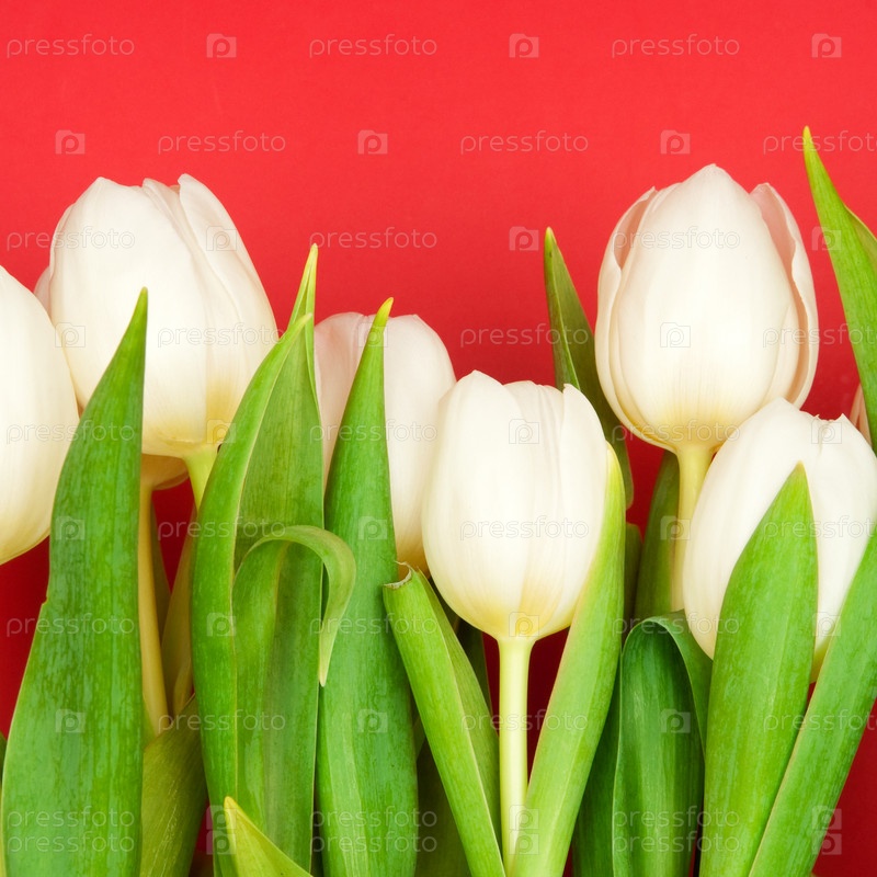 Белые тюльпаны на красном фоне