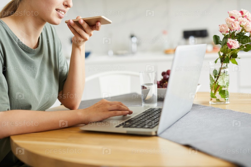 Современная мобильная девушка записывает голосовое сообщение перед ноутбуком