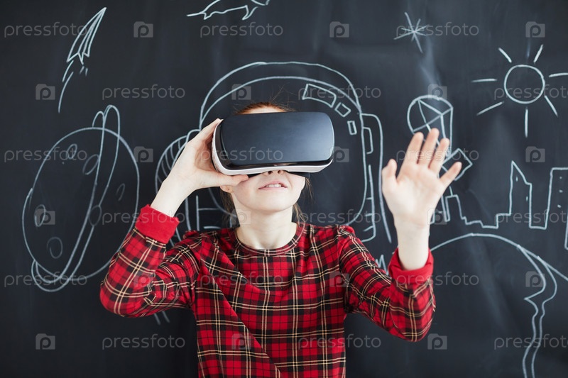 Содержание любопытная школьница в гарнитуре виртуальной реальности, стоящая на доске с маской астронавта и чертежами города и жестом руки во время игры