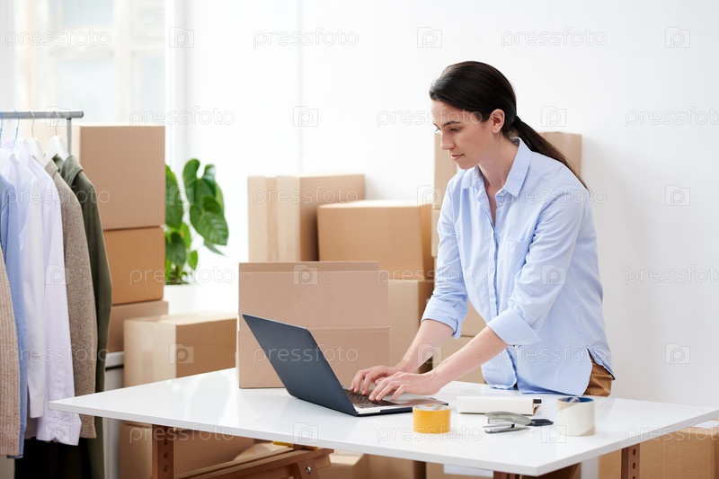 Молодая брюнетка, принимающая заказы перед ноутбуком