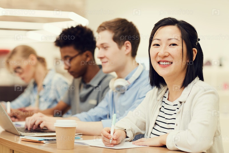 Портрет улыбающейся молодой азиатской студентки с короткими волосами, сидящей за столом со своими одноклассниками в лекционной и обобщающей информацию