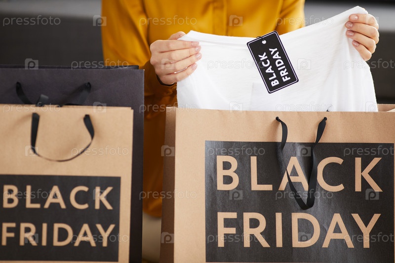 Близкий план неузнаваемой женщины, вынимающей одежду из бумажных пакетов: она изучает размер рубашки, купленной на распродаже в черную пятницу