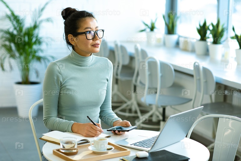 Красивая азиатская студентка в очках сидит за столом перед ноутбуком в кафе