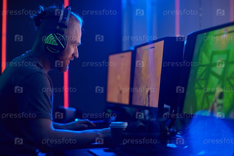 Человек играет в темном классе компьютеров