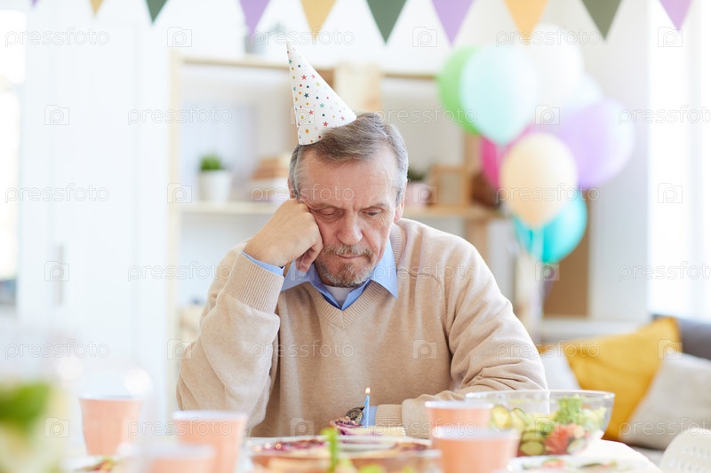 Одинокий мужчина смотрит на день рождения торт со свечкой