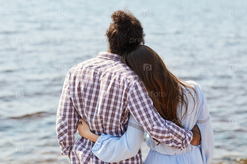 Молодая пара обнимается у озера